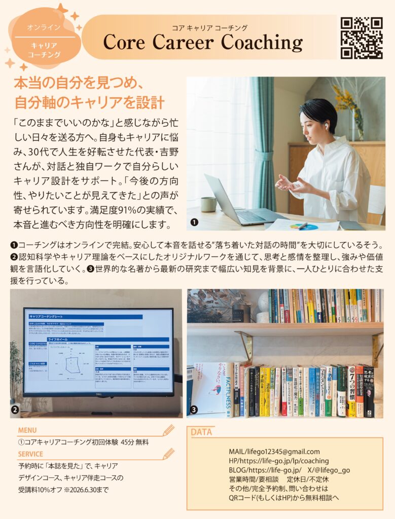 Core Career Coachingのコーチングはキャリアにフォーカスしながらも具体的な転職や独立、部署異動の方法論以上に、本来の自分を知る自己理解にフォーカスしています。